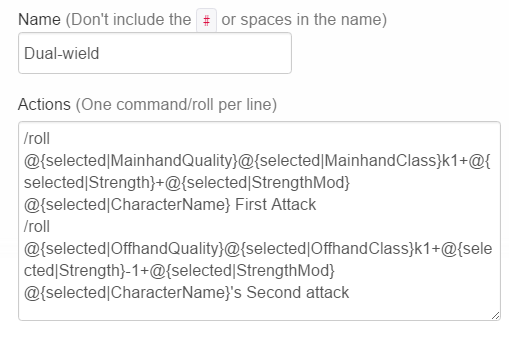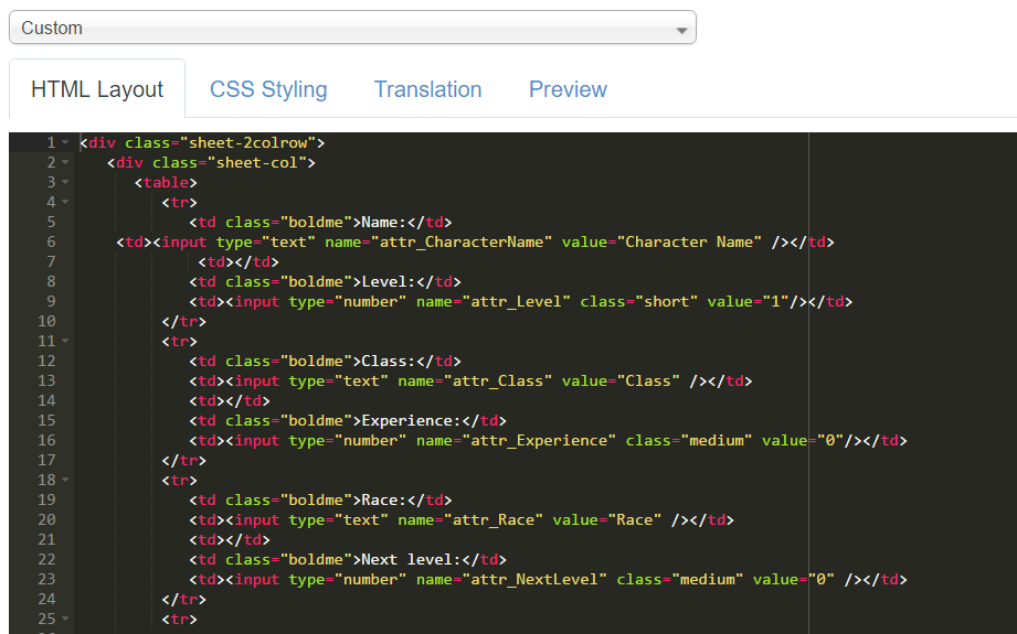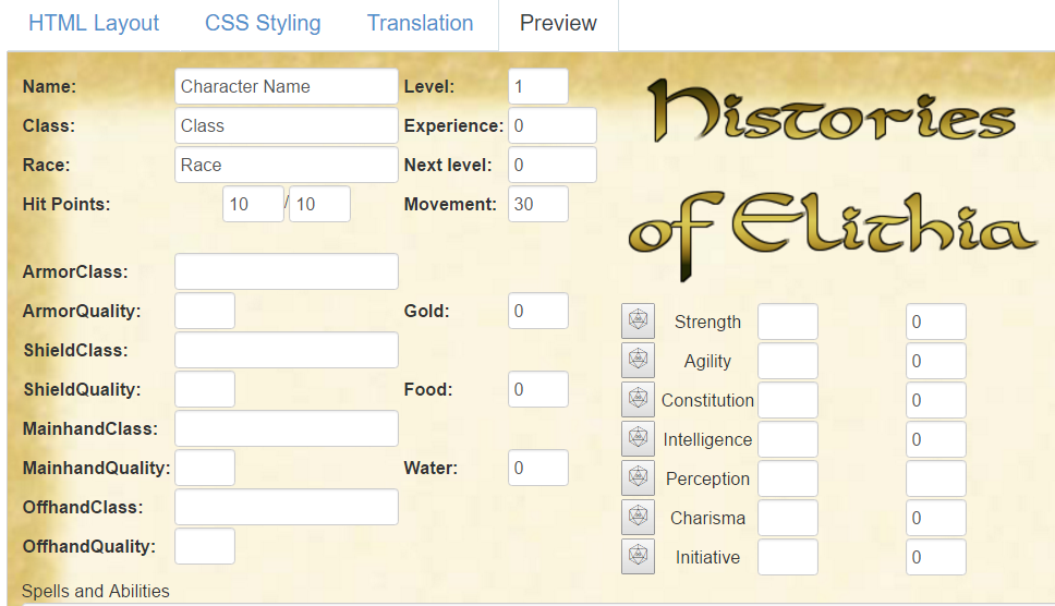 All game logic, actions and abilities were coded in a custom roll20 specific script, referencing the HTML for variables.